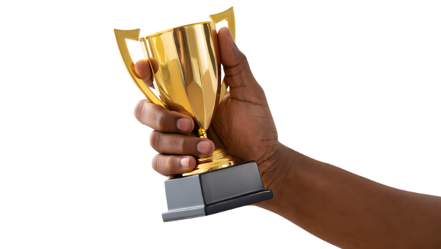 Winning trophy held in hand isolated on white background, victory and achievement illustration, success symbol, championship award, motivational sports celebration PNG.