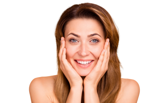 Close up photo beautiful amazing mature she her lady hold hands arms cheeks cheekbones show great got much younger facial skin result anti-age mask procedures nude isolated pastel beige background