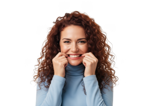 Young woman with curly hair and blue turtleneck smiling and looking directly at the camera with her hands near her face isolated on transparent background