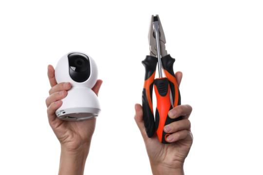 PNG,Video surveillance camera with pliers, isolated on white background