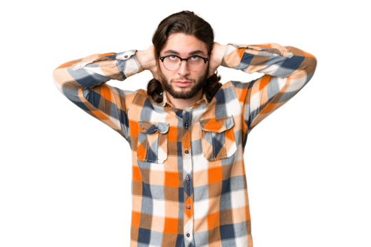 Young man with beard over isolated chroma key background frustrated and covering ears