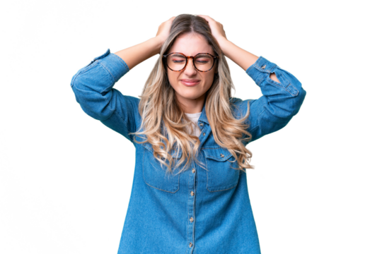 Young pretty caucasian woman over isolated background frustrated and covering ears