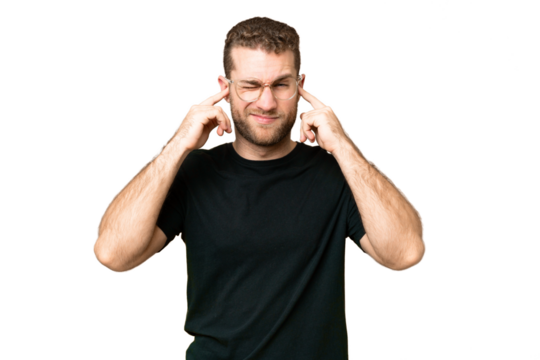 Young handsome caucasian man over isolated chroma key background frustrated and covering ears