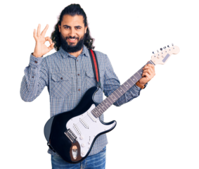 Young arab man playing electric guitar doing ok sign with fingers, smiling friendly gesturing excellent symbol
