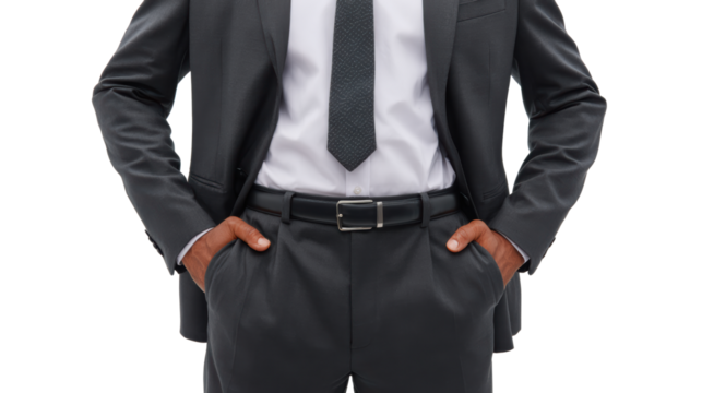 PNG of A male figure in light blue pleated trousers and brown shoes, exuding a classic style with hands in pockets.