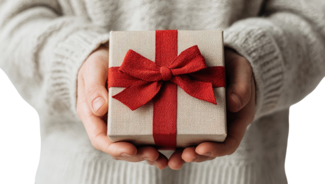 Hands holding a small, light beige gift box with a red ribbon and bow