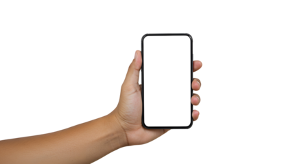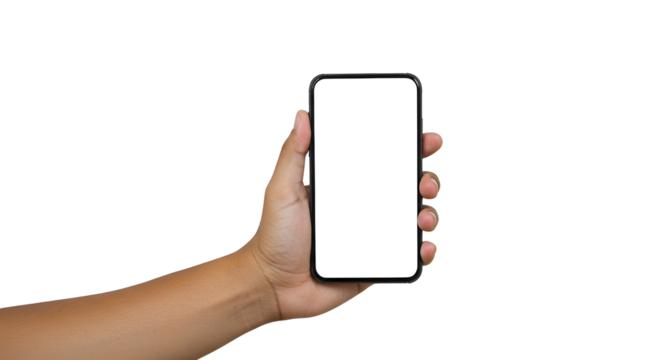 Hand holding a smartphone with blank screen isolated on transparent background for mockup template advertising and branding technology concept