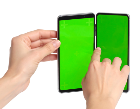 Hands holding modern smartphones with blank white screens on transparent background for creative