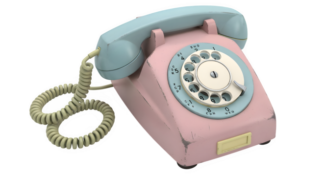 Vintage pink and blue rotary telephone with coiled cord isolated on transparent background
