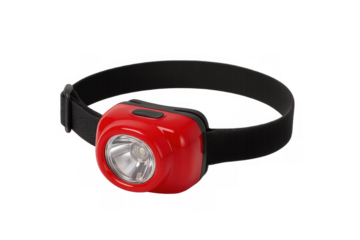 Red headlamp with black headband isolated on transparent background, providing portable illumination for hands-free tasks