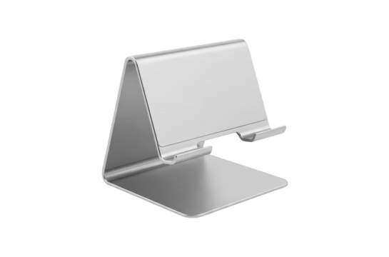 Three dimensional rendering of a modern silver metallic smartphone or tablet stand with a folded minimalist design