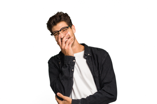 Young caucasian handsome man isolated laughing happy, carefree, natural emotion.