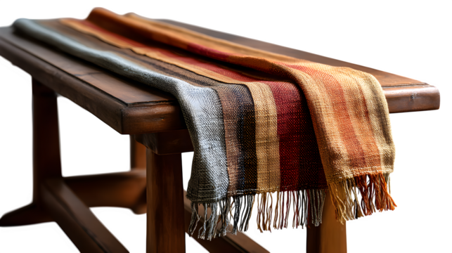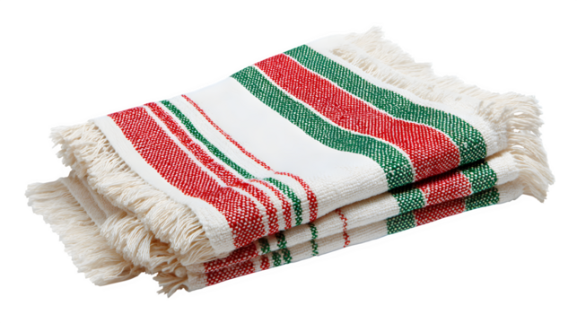 Handwoven cotton napkin with fringe edges and red/green stripe pattern, isolated on white background