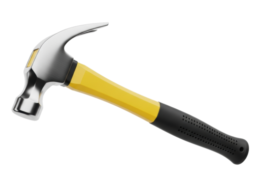 A pristine claw hammer with a polished metallic silver head, vibrant yellow handle, and black rubber grip, against a transparent background with copy space, concept of tools and professional