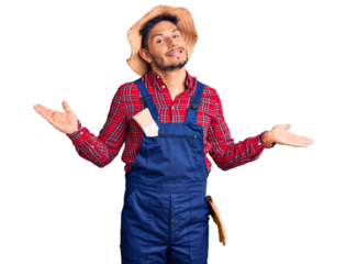 Handsome latin american young man weaing handyman uniform smiling showing both hands open palms, presenting and advertising comparison and balance