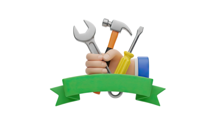 3D Hand Holding Tools with a Green Banner on transparent background