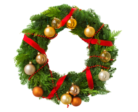 Close up of a detailed evergreen tree branch adorned with five colorful shiny christmas ornaments hanging isolated on transparent background