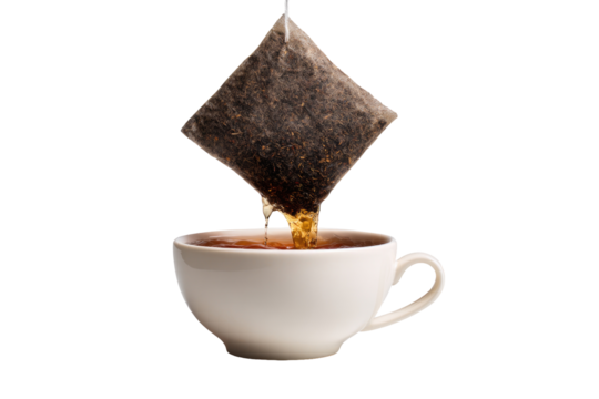 Tea bag pouring into a white cup
