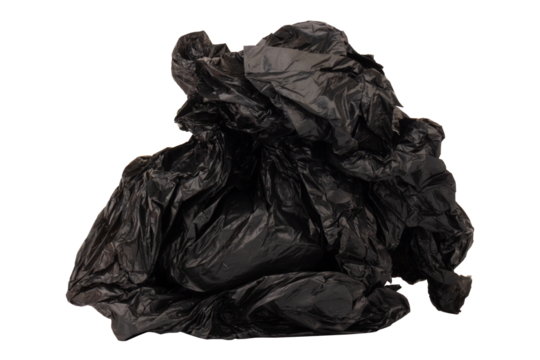 A plain black shopping bag with a blank white tag hanging from its handle, isolated on a transparent background