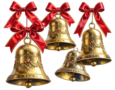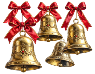 Golden christmas bells hanging from a festive bow, celebrating the holiday season with a vintage touch, transparent background