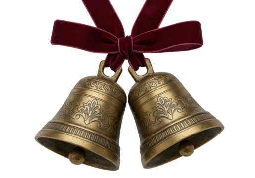 Two golden Christmas bells with red velvet bow isolated on transparent background, holiday decoration for festive season