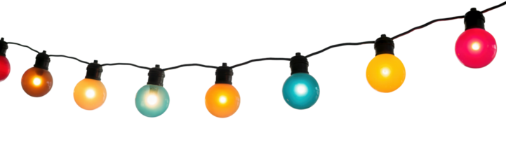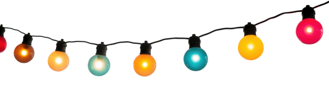 A string of colorful oval shaped festive lights glowing brightly in various warm and cool tones isolated on transparent background