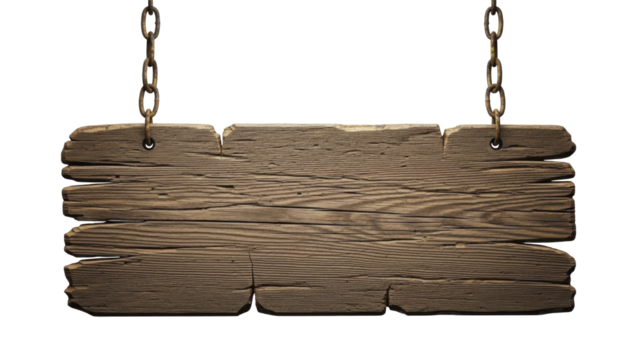 Weathered wooden sign hanging from rusty chains on a transparent background, PNG file