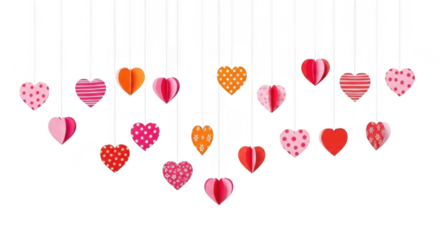 Festive red paper hearts garland strung on twine against white and transparent background, perfect for adding love. Concept for Valentine's Day decor, romantic event design and festive backgrounds