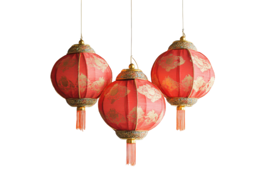 Red chinese lanterns hanging isolated on transparent background. Red chinese lanterns with gold accents hanging against a white background.