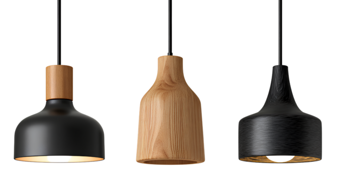 Assortment of pendant lights with various shapes and materials hanging against a dark background space