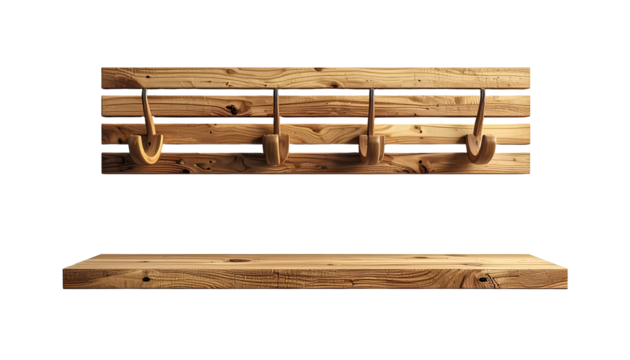 Wooden wall-mounted rack featuring four unique wooden hooks hanging from horizontal wooden slats above a simple wooden shelf, all against a stark black background, creating a minimalist and modern...