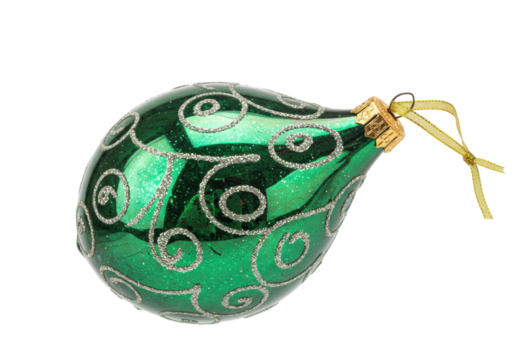 Isolated green Christmas bauble decorated with silver glitter spirals and gold ribbon loop