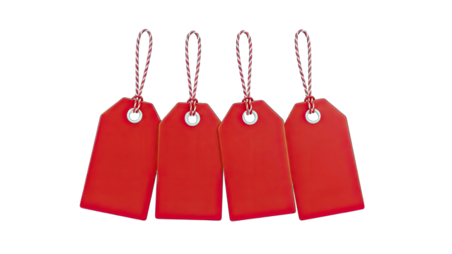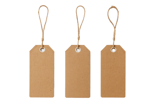 Three blank rectangular tags with rounded corners hanging from strings isolated on a transparent background