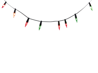 Colorful Christmas string lights hanging horizontally on a white background.  PNG transparent.