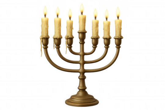 Golden menorah with seven burning candles, symbolizing judaism, hannukah festival, tradition, light, and religion