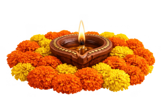Clay diya creating a glowing light, surrounded by marigold flowers, celebrating the diwali festival of lights