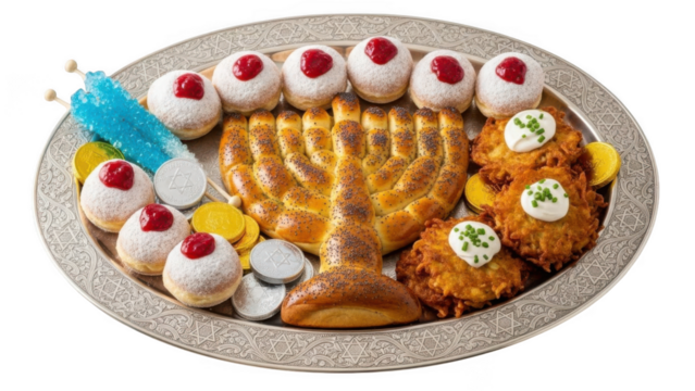 Hanukkah menorah bread with festive treats isolated on transparent background