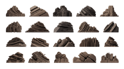 Charcoal chunks pile isolated on isolated background. Black rocks vary in size, shape scattered across gray background. Rocks arranged in haphazard manner, overlapping, standing alone. Gray background