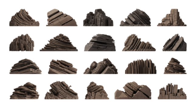 Collection of various stacked brown wooden planks on white background
