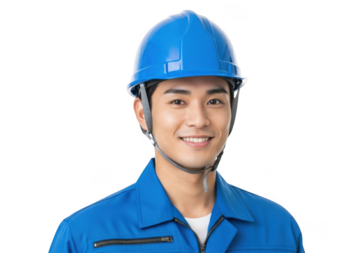 Young asian male construction worker wearing blue hard hat and uniform smiling happily isolated on transparent background