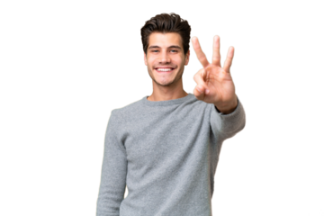 Young handsome caucasian man over isolated background happy and counting three with fingers