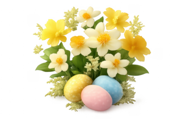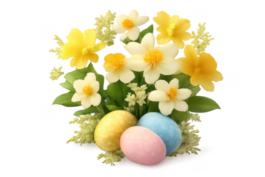 PNG. Happy Easter. Three colorful eggs and spring yellow flowers. isolate