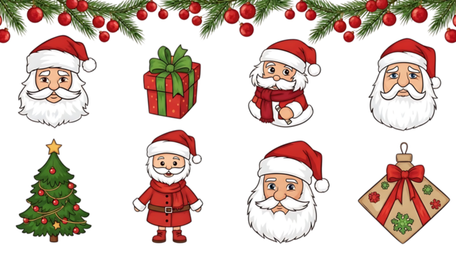 Christmas Santa Claus characters and festive elements on black holiday celebration