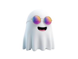 White ghost wearing colorful sparkly round glasses and smiling image, Isolated, Png Transparent Background