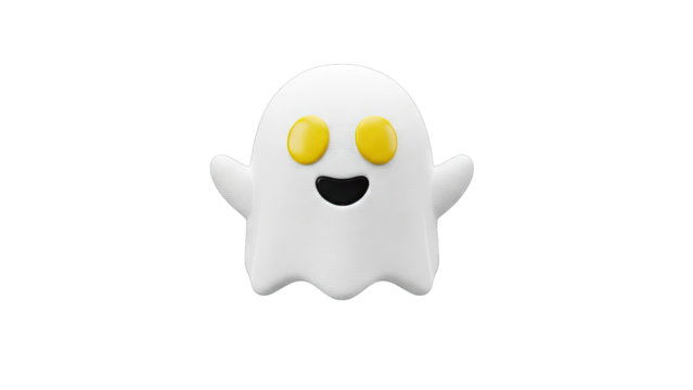 Cute white ghost character smiling and floating, celebrating halloween with a happy, spooky face on transparent background