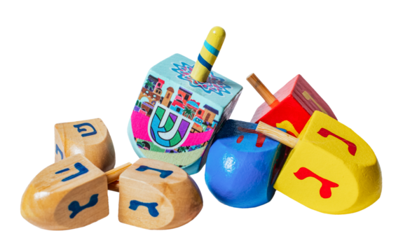 Wooden dreidels for Hanukkah isolated on white or transparent background.