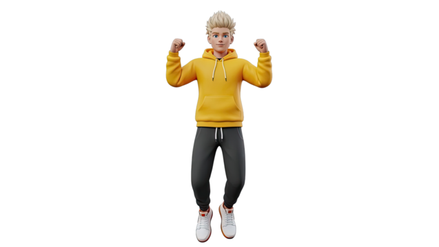Man in pilot costume jumping in the air with excitement, isolated on transparent background