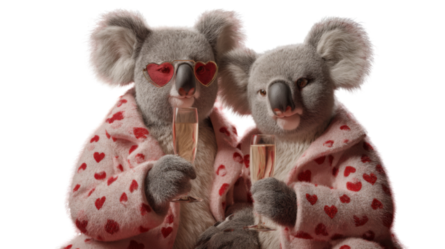 Koala Champagne Toast: Adorable koalas, dressed in heart-patterned pajamas and stylish sunglasses, share a celebratory champagne toast, symbolizing joy and companionship.
