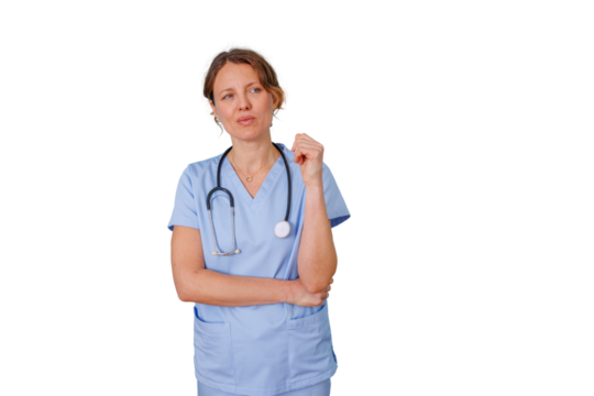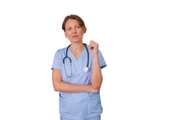Female nurse in scrubs feeling thoughtful and contemplating, wearing stethoscope, transparent background