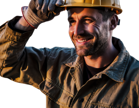 Smiling bearded construction worker beige jacket, grey gloves, yellow hard hat, adjusting headwear, looking happily, isolated on white background